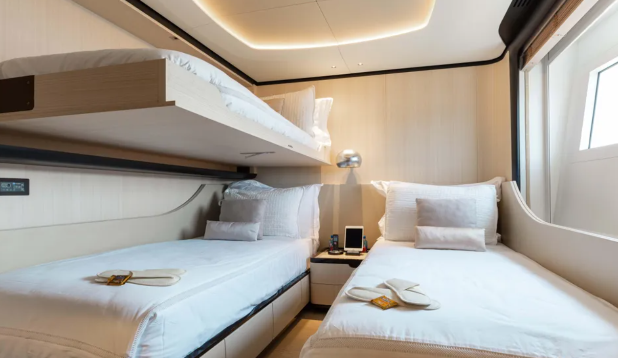 Ana Güverte Geniş Owner Kabin, özel banyo ve giyinme odası Alt Güverte : 2 x VIP kabin + 1 x Twin Kabin + 1 x Twin kabin + Pullman Yatak Mürettebat : 5 kişilik personel için 3 kabin ( kaptan + 2 mürettebat kabin)